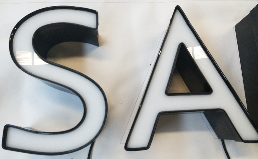 外露的LED发光字装单个LED灯,发光统一;内发光字穿过发光,灯箱,和效果。